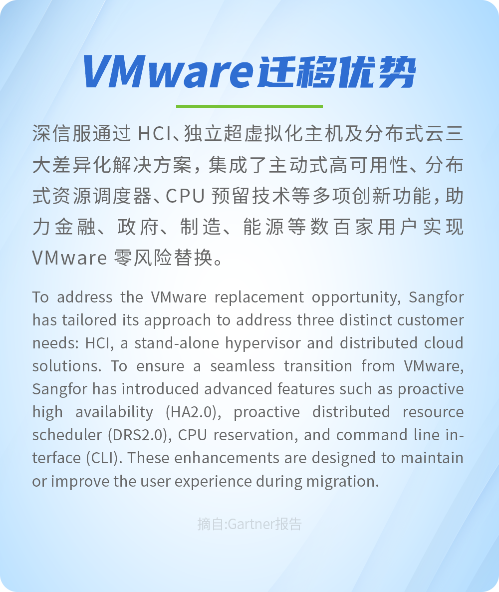 报告中,Gartner从 “全栈集成”、 “AI技术创新”、 “VMware替换”三大维度,高度评价深信服。